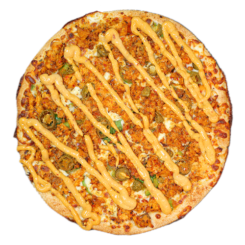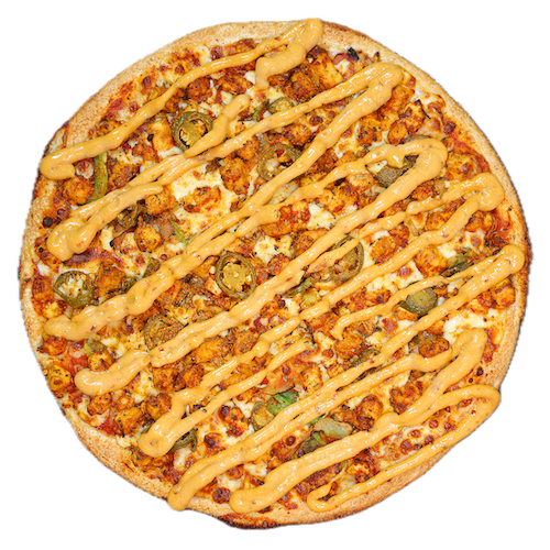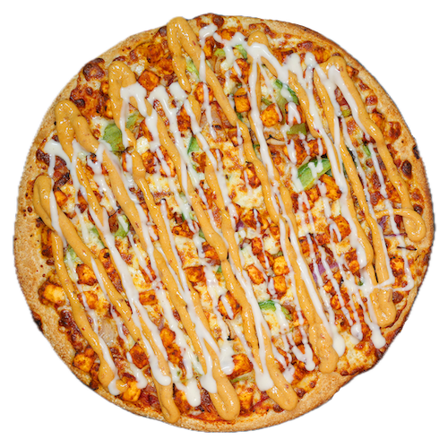 Paneer marinated in our in-house tandoori paste with spinach, red onion, capsicum and mozzarella on a herb-infused tomato base, finished with peri peri and ranch