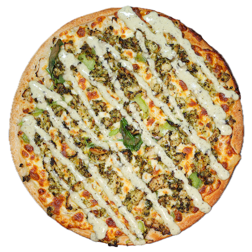 Chicken tossed in basil pesto with spinach, red onion, capsicum and mozzarella on a garlic base, finished with a pesto swirl