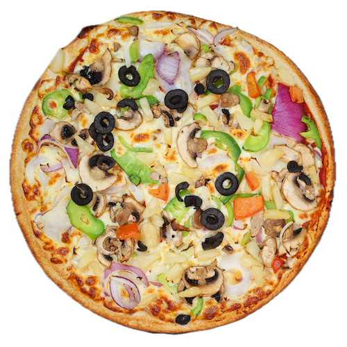 Onion, tomatoes, capsicum, pineapple, mushrooms, olives and mozzarella on a herb tomato base
